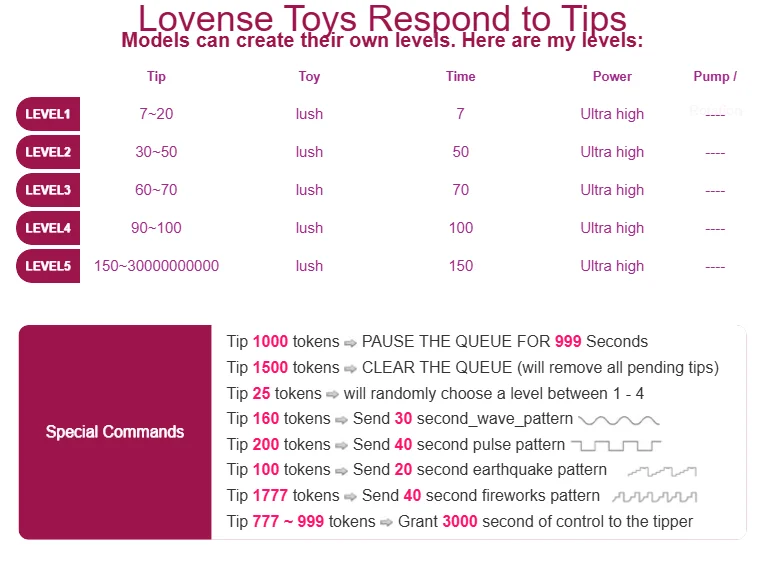 كلام بذئ, رقص مثير, أهيجاو, تعليمات الاستمناء, تعليمات أكل المني, نشوة, مكتب, تقييم الزبر, رقص التعري, صفع, تعري, رقص التويرك, سائل ما قبل القذف, مص, العادة السرية, تصبيع, خلفي, ألعاب شرجية, بلع, قضيب صناعي أو هزاز, دش, فاضح جدًا, قذف المني